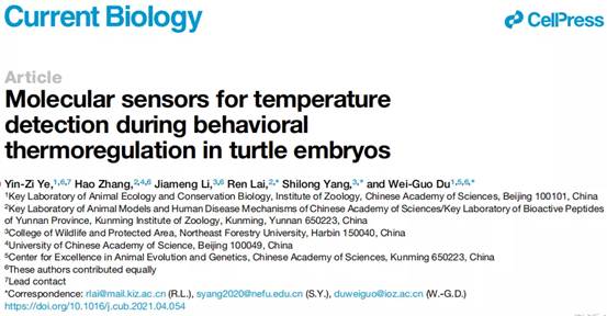 2021年5月19日,杜卫国团队联合我院杨仕隆团队和中国科学院昆明动物研究所赖仞研究团队,在Cell子刊Current Biology(Top期刊 5-year IF=10.2)上发表了题为“Molecular sensors for temperature detection during behavioral thermoregulation in turtle embryos”的研究论文,揭示了爬行动物胚胎行为热调节的分子基础。通过行为学、分子生物学、激光瞬时温控、电生理和药理学等整合生物学研究手段,研究人员发现TRPA1和TRPV1是胚胎行为热调节过程中感知温度变化的关键离子通道。TRPA1用于感受温和热刺激(28-32℃)并帮助乌龟胚胎向热源移动,而当温度进入伤害性热刺激范围时(>32℃),TRPV1激活并帮助乌龟胚胎远离热源。因此,在胚胎行为热调节中,TRPA1和TRPV1形成了一个无缝连接的生理分子温度计用于检测卵内的不同温度区域并调整胚胎所处的位置。