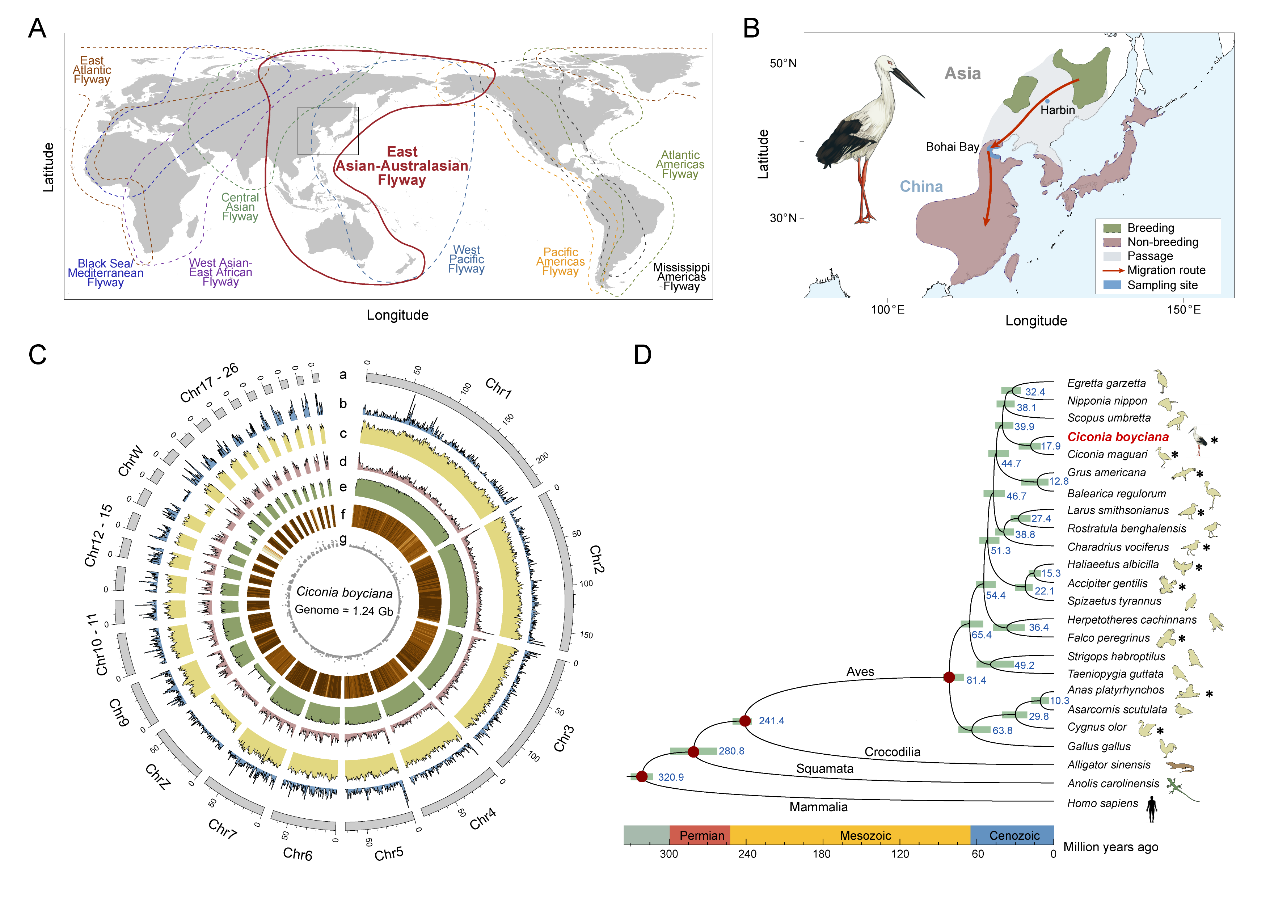 近日,东北林业大学兰天明团队和侯志军团队联合多单位,在国际期刊《GigaScience》(IF=11.8)上发表了题为“Genomic exploration of the endangered oriental stork, Ciconia boyciana, sheds light on migration adaptation and future conservation”的研究论文。该研究组装了濒危候鸟东方白鹳首个染色体水平基因组,对野生和圈养种群进行了群体基因组学比较研究,解析了东方白鹳濒危的遗传特征和历史,并对其长距离迁徙适应性的基因组学基础进行了探索,为候鸟的未来保护工作提供了重要参考。