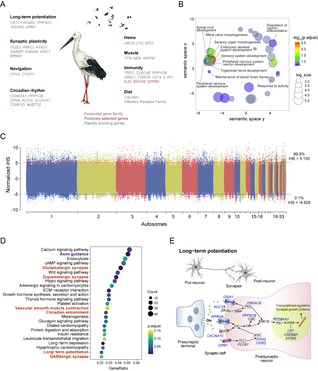为了探索东方白鹳长距离迁徙习性的基因组学基础,研究人员将其与其他迁徙鸟类及非迁徙鸟类进行了比较基因组学研究,发现了一系列与长时程增强、突触可塑性、导航、肌肉发育和免疫反应等相关的扩张基因家族、正选择基因和快速进化基因(图5A和B)。另外,基于野生群体全基因组遗传变异信息,发现近期受选择的单核苷酸变异位点主要与学习与记忆等神经元功能相关,涉及到著名的ADCY8基因,以及长时程增强KEGG通路上的其他基因。这些发现为理解东方白鹳的迁徙适应性提供了重要的基因组学依据。