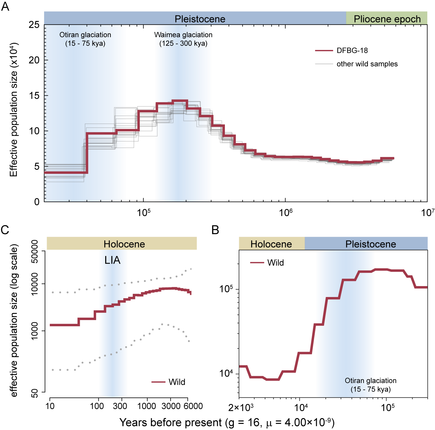 种群历史分析结果显示,在过去600万年(My)里,东方白鹳经历了两次种群扩张和两次种群衰退过程,最终有效种群规模(Ne)降至约1000(图4)。值得注意的是,东方白鹳种群最近一次的衰退情况并不严重,这可能是目前野生种群仍具有较高遗传多样性的原因所在。研究团队结合东方白鹳繁殖与越冬区域的地理环境和人文历史信息,推断其种群近期的快速下降可能是气候变化和人类活动共同作用的结果。