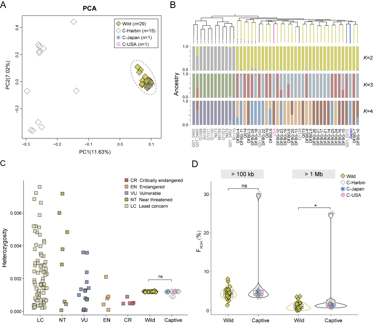 此外,研究团队还对29只野生东方白鹳和15只圈养个体进行了基因组重测序,并收集了日本和美国各一只圈养个体的全基因组测序数据进行对比分析。通过聚类分析发现,野生东方白鹳呈现单一的遗传结构,圈养个体的遗传背景更复杂(图3 A)。核苷酸多样性以及等位基因频谱等多方面证据显示,野生种群具有更高的遗传多样性,而圈养种群中的遗传漂变效应更为显著。随后,研究团队对种群的近交情况和遗传负荷等进行了计算和推演。结果显示,尽管上世纪东方白鹳数量大幅减少,但目前野生和圈养种群的全基因组杂合度仍然较高,同时近交水平较低(图3C和D)。这一发现表明,在遗传上,东方白鹳种群可能仍具有较高的复壮潜力,对其未来的种群恢复是一个积极的信号。但是,研究人员在两只圈养个体中发现了近期高度近交的情况(图3 D),再次强调了对小种群进行谱系管理的重要性。