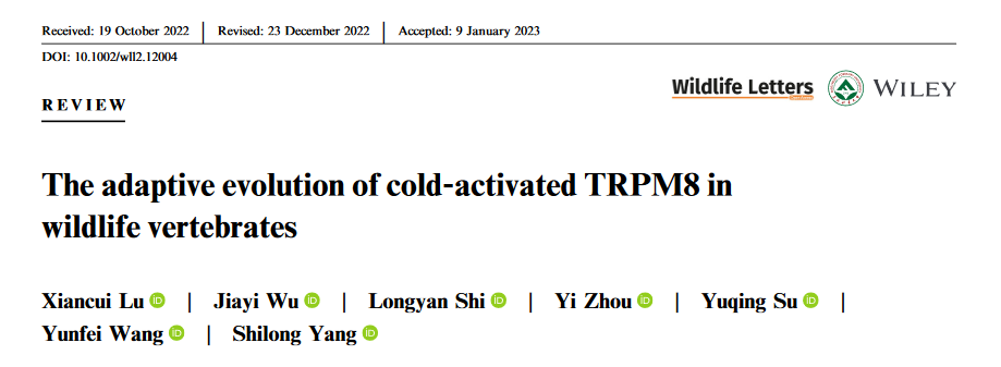 2023年03月12日《Wildlife Letters》发表了我校野生动物与自然保护地学院陆先翠副教授的题为“The adaptive evolution of cold-activated TRPM8 in wildlife vertebrates”的综述论文,该论文系统性地总结了低温敏感受体TRPM8结构和功能进化与动物生境温度适应的联系。