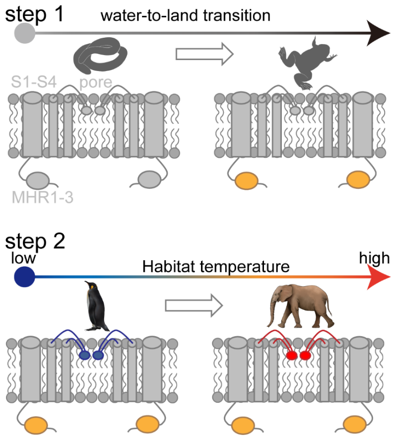 TRPM8作为典型的冷敏感受体,在高等哺乳动物中(譬如人)介导机体对26度以下低温的响应,trpm8基因敲除能够改变动物的低温感知和低温耐受能力。基于此,trpm8基因的起源和功能进化是动物肢体感知觉系统演化的重要节点。与起源古老的热感知基因trpv1相比,trpm8基因并未出现在辐鳍鱼类及更为低等动物的基因组中。现存最早进化出trpm8基因的物种是肺鱼——所有陆生四足动物的共同祖先。在肺鱼基因扩张的过程中,trpm2基因的复制和外显子的重排形成了trpm8基因雏形(编码的蛋白不具备功能)。肺鱼在为登陆做准备的过程中,发生了一系列形态和生理功能的变化。由于空气比热容远低于海水,日夜交替导致陆地温度波动较海洋更为剧烈。在生境温度转变的进化压力背景下,trpm8基因在肺鱼的出现代表着动物登陆过程中温度感觉系统重大新功能的出现。