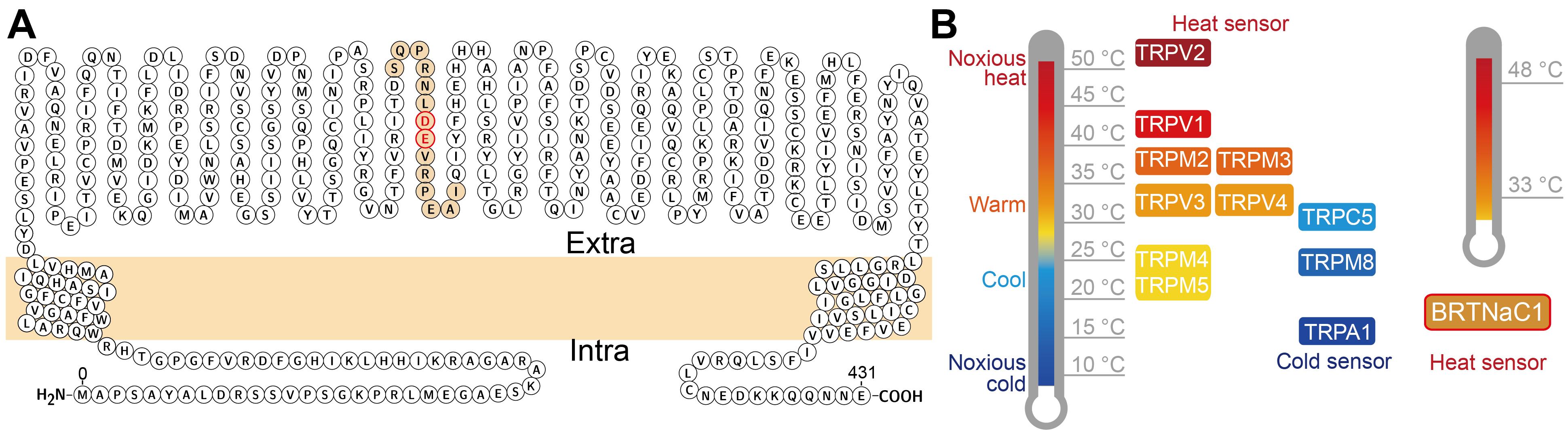 动物的温度敏感受体能够响应外界和动物体自身温度变化。2021年诺贝尔生理学或医学奖授予了温度敏感受体TRP离子通道的发现者David Julius教授。TRP是一类同源四聚体离子通道,该超家族中发挥温度感受器功能的成员被称为ThermoTRP,包括典型的热敏感受体TRPV1和冷敏感受体TRPM8。当温度发生改变时,神经元细胞膜上的ThermoTRP能够瞬时响应温度刺激,由关闭态变为开放态,介导阳离子内流并介导动作电位的产生。因此,ThermoTRP是动物体建立温度感知的初级受体。有趣的是,在动物从低等向高等进化的历程中,部分ThermoTRP出现时间非常晚(譬如在陆生脊椎动物中才进化出TRPM8),部分ThermoTRP的温度敏感性具有很强的物种特异性(譬如小鼠TRPA1为低温激活,爬行动物TRPA1为高温激活)。这些现象提示,除了ThermoTRP以外,一些动物可能还存在其他建立温度感知的初级受体,即新型温度敏感受体,而这些受体或许还能够参与响应外界和自身温度变化之外的其他生命过程。