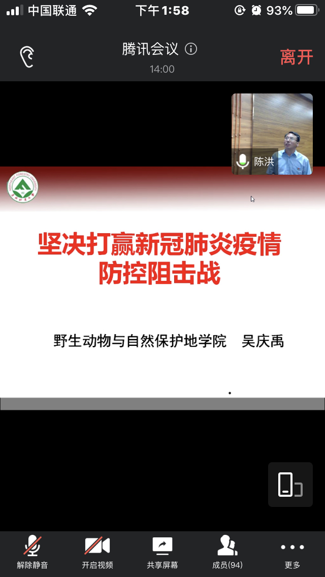 2020年7月8日下午2时,东北林业大学野生动物与自然保护地学院党委书记吴庆禹以腾讯会议直播的形式,为动保学院全体党员讲授题为“坚决打赢新冠肺炎疫情防控阻击战”的微党课,全体师生党员线上收听。