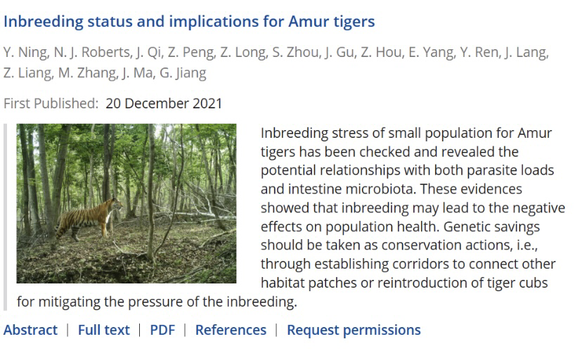 2021年12月21日我院姜广顺教授团队在国际期刊《Animal conservation》(《动物保护》)上在线发表题为《“Inbreeding status and implications for Amurtigers”》(《东北虎种群的近交状态及保护意义》)的研究成果。该成果表明,虽然我国野生东北虎种群迅速增长,但并未使其摆脱小种群近交威胁的困境。