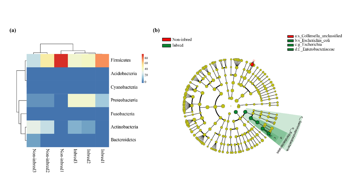 (a) 基于完全聚类方法显示野生东北虎近交组与非近交组间在门水平上的相对丰度的比较;(b) 使用LEfSe分析生成的分支图以显示近交组和非近交组之间在七个分类群上的显著性差异。