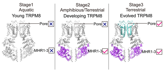 而孔区的进化选择则发生在陆生脊椎动物的演化中,这种机制通过调整孔区的整体疏水性来调控TRPM8的冷激活效率,进而辅助陆生脊椎动物适应生境温度。研究人员还发现,MHR1-3结构域是孔区进行冷激活效率调控的前提,若MHR1-3不具备独立的温度变构能力,则单独的孔区疏水性调节无法使非冷敏感性TRPM8获得冷敏感性。因此,陆生脊椎动物在进化出低温响应MHR1-3结构域的基础上,进而通过物种特异性的孔区结构域来调节TRPM8的冷激活效率。