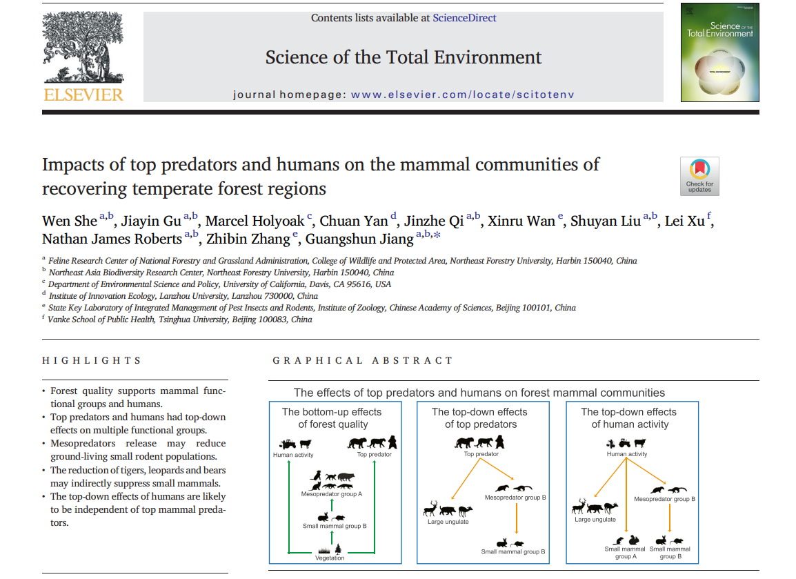 Wen She, Jiayin Gu, Marcel Holyoak, Chuan Yan, Jinzhe Qi, Xinru Wan, Shuyan Liu, Lei Xu, Nathan James Roberts, Zhibin Zhang, Guangshun Jiang. 2023. Impacts of top predators and humans on the mammal communities of recovering temperate forest regions.Science of The Total Environment.862:160812.https://doi.org/10.1016/j.scitotenv.2022.160812.