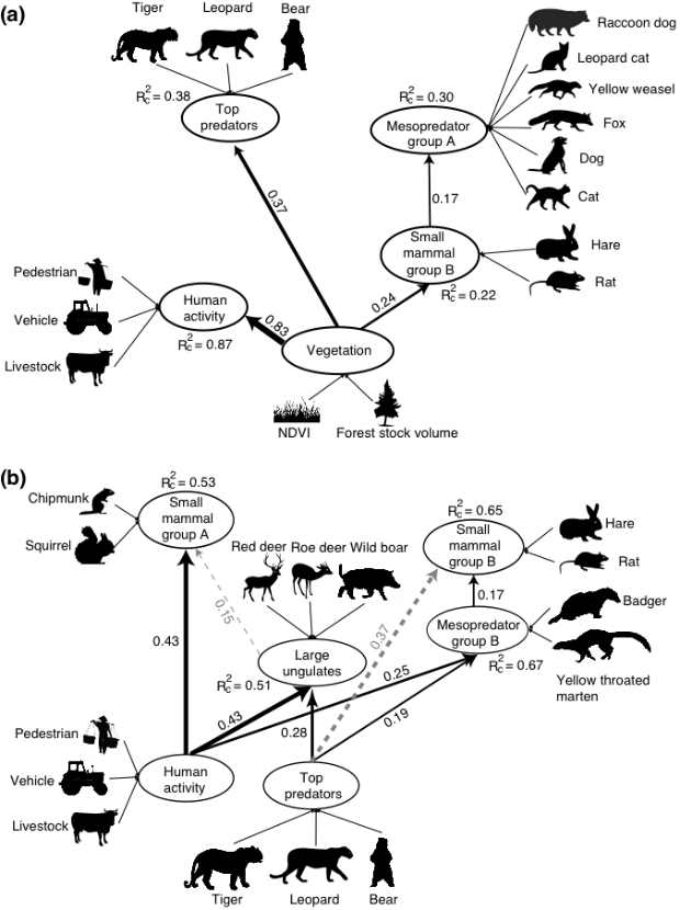 哺乳动物群落调控功能研究中,较多物种之间有效互作关系的研究是本领域的难题。本研究通过比较高和低东北虎种群丰度的研究区域中各哺乳动物物种丰富度的差异,识别和构建了群落结构的3条上行(Bottom-upeffect)和5条下行(Top-down effect)效应关系链的概念模型,并将生态调节功能研究的维度从物种层面简化到功能群层面,结合利用分段结构方程模型、随机森林模型,以及相关性分析方法,验证了植被、顶级捕食者和人类活动对森林哺乳动物功能群的上行和下行效应的路径,证实了恢复栖息地植被和科学管理人类活动强度的重要性的原因机制。