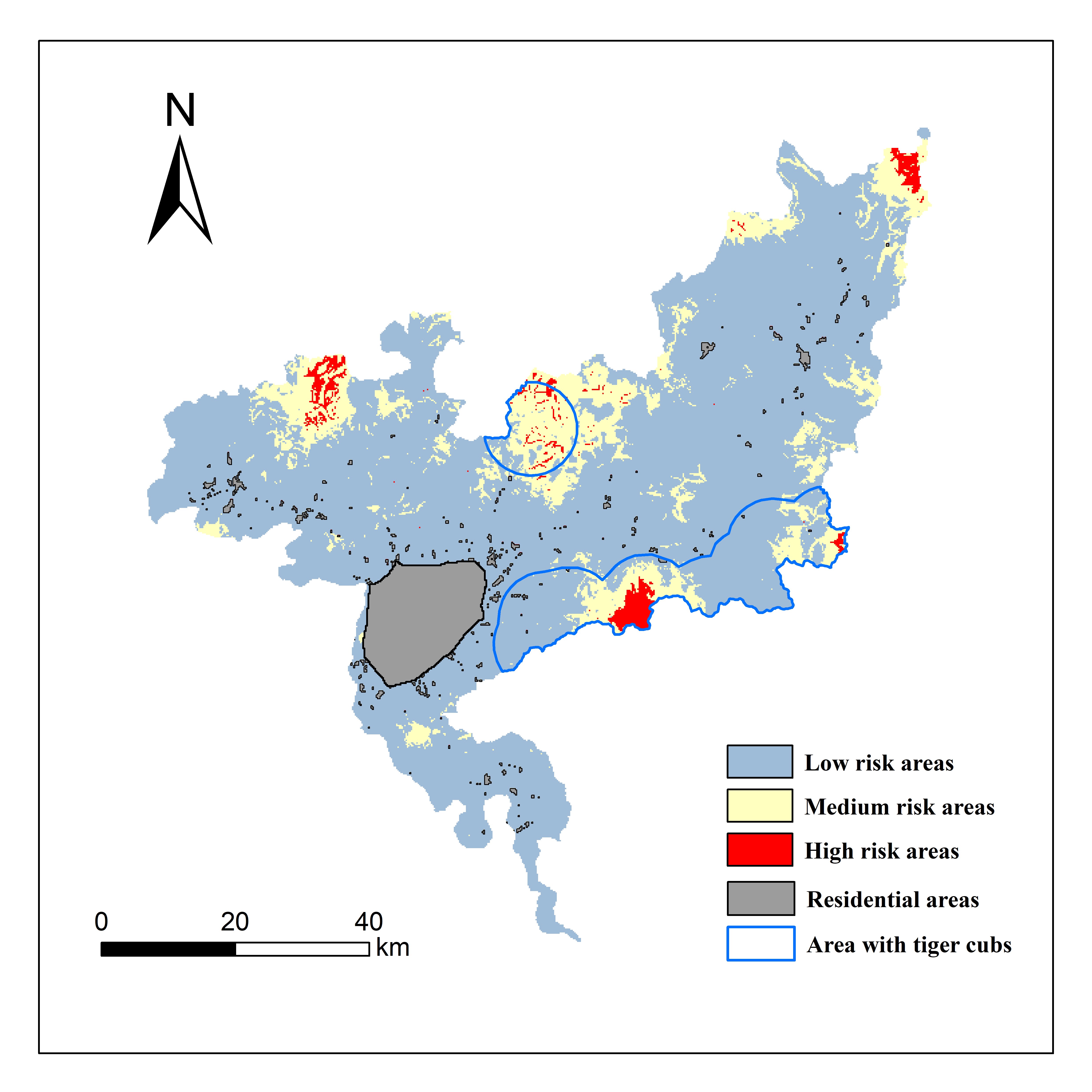 本研究基于2014-2019年东北虎豹国家公园珲春区域东北虎捕食家畜的数据和自动相机监测数据,应用模型预测了东北虎出现和捕食家畜的概率,并绘制了人虎潜在冲突的风险分区图。研究发现,在野生有蹄类猎物密度低且靠近放牧地的区域,东北虎对家畜的捕食会加剧。基于模型结果及东北虎和人类在时间和空间生态位的共享情况,将人类活动和东北虎生态位利用的重叠程度划分为潜在低、中和高风险冲突区域,提出了缓解当地人虎冲突有关恢复有蹄类、分区分时间管控人类活动、加强冲突监测预警等的建议。