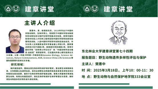 樊惠中,男,助理研究员,2019年毕业于中国科学院动物所,生物学博士。现就职于中国科学院动物研究所动物生态与保护生物学院重点实验室,获得中国科协青年科技人才托举工程项目和中国科学院特别研究助理项目资助,入选中国科学院青年创新促进会会员。作为负责人主持国家自然科学基金面上项目2项,国家重点研发计划子课题2项,部委委托项目课题1项。获得中国科学院“优秀博士学位论文”和“中国动物学会长隆奖-启航奖”等荣誉称号。已在国内外核心期刊发表论文30余篇,以第一作者/共同第一作者身份在Genome Biology, Science Advances, Nature Commutations, NSR, Science China Life Sciences等国际重要期刊发表论文多篇。